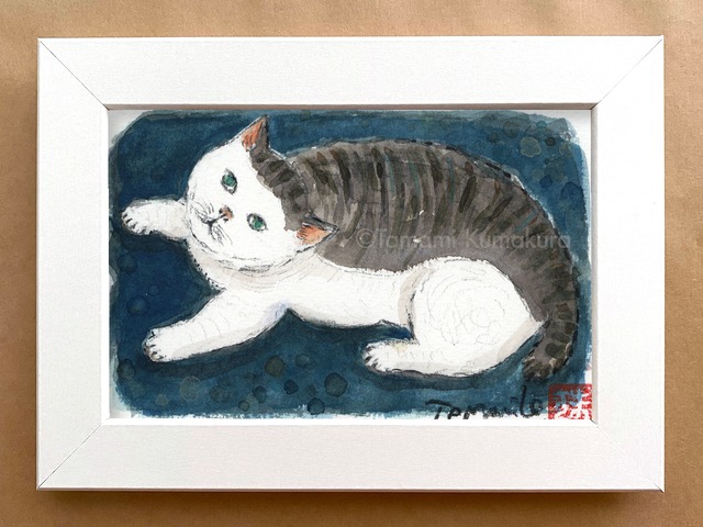 原画「鰹と書く猫」ポストカードサイズ なかなか達筆です。 原画一点ものです。 仮額付き(そのまま飾っていただくか、お好きなマットや額装をご用意ください) 仮額の種類は種類が変更になる場合がございます。白か黒の仮額をおつけいたします。 モニターやスマホでは色味が違って見える場合がありますのであらかじめご了承ください。 同梱について:他の商品と同梱できません。 その他:原画の著作権は作者に帰属しています。二次使用はできません。