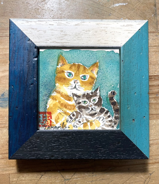 ミニ原画「ふたりの猫」ミニ原画 透明水彩画 ミニ原画約78mmx78mm(額サイズ約115mmx115mm、幅約17mm) 自立する額幅です。壁掛け用にネジでとめる小さなフックもおつけします。 京都の画材屋さんで調達したミニ額に原画を入れました。 手作り額なので、木の節や小さな穴が空いていますこと、ご了承いただき、ご購入をお願いいたします。 小さな作品なので、サイズをお確かめください。 額の窓が原画より内側なため、原画の周りは写真のようにトリミングされた形で額装されています。 原画一点ものです。 モニターやスマホでは色味が違って見える場合がありますのであらかじめご了承ください。 その他:原画の著作権は作者に帰属しています。二次使用はできません。