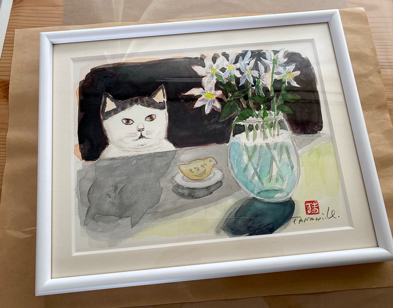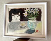 猫と静物シリーズで、クレマチスともなかを描きました。