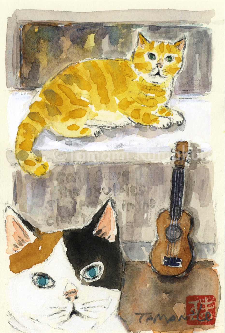 原画「猫は押し入れで眠っているウクレレを救う〜Cats save the ukulele sleeping in closet」ポストカードサイズ