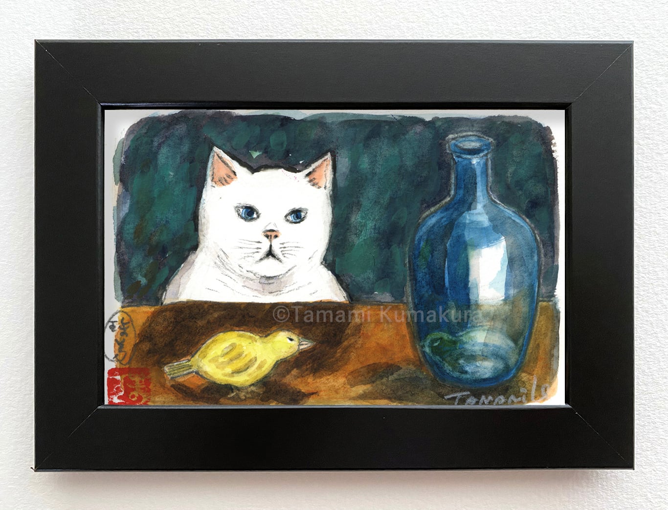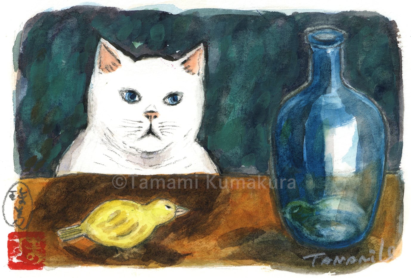 原画「白猫とカナリアと青いガラスびん」ポストカードサイズ