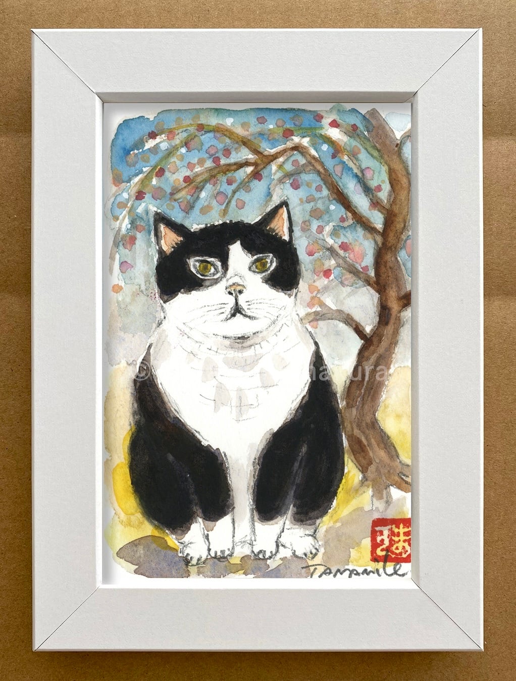原画「紅枝垂れ梅と白黒猫」ポストカードサイズ