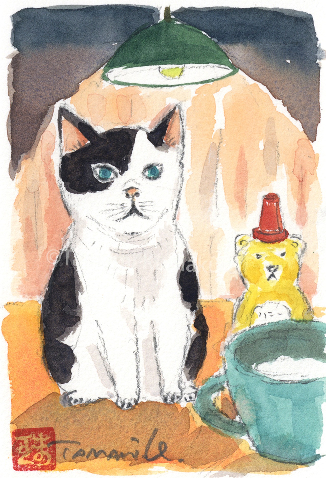 原画「猫と夜のティータイム」ポストカードサイズ