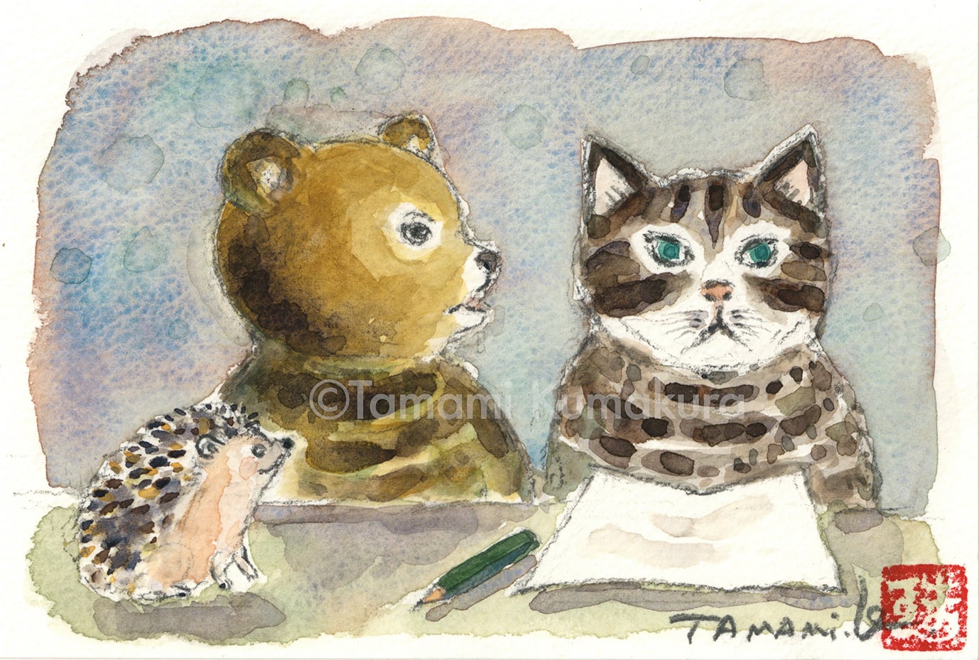 原画「筆不精な猫と小言をいう熊とそれを見ているハリネズミ」ポストカードサイズ